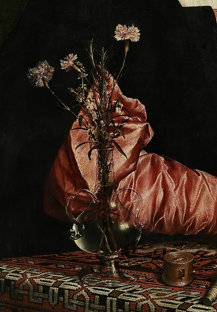 Les cariatides de part et d’autre de Danae portent sur leur tête un panier rempli de fleurs sur lesquelles reposent les poutres, comme si un bouquet avait la force de supporter un tel poids. Cette tapisserie montre à quel point les différends éléments décoratifs de la galerie étaient imbriqués les uns dans les autres, ce qui procurait un sentiment de continuité forte entre le plafond, les fresques et les boiseries.